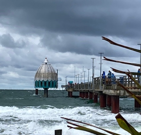 Trotz nasskalten Wetters strömen die Urlauber durch den Ort, der sich von den anderen dadurch unterscheidet, dass man auch Camp David, Wellenstein und andere Label- Läden zum Shoppen findet und dass der Sanddorn Caipi 9 Euro kostet. (immer noch günstiger als auf Sylt) Die Seebrücke ächzt unter der Völkerwanderung zur Tauchglocke.