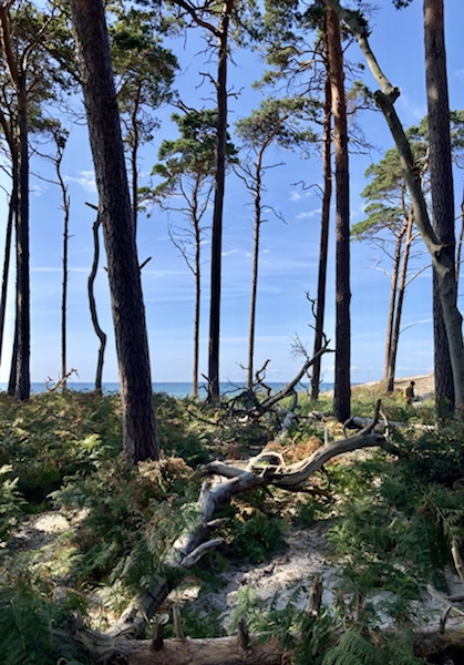 Da der nördliche Teil (Darßer Wald und Weststrand) nur zu Fuß oder mit dem Rad erkundet werden kann, gibt es eine holprige Fahrrad- „Autobahn“ durch den endlosen Wald, von der man ab und zu zum hochgepriesenen Weststrand abbiegen kann. Auch dieser ist gut besucht, zahllose Fahrräder zusammengepfercht, die wenigen Abstellmöglichkeiten total überlastet. Algenteppich am Ufer. Aber immerhin: Sandstrand. Naturstrand.