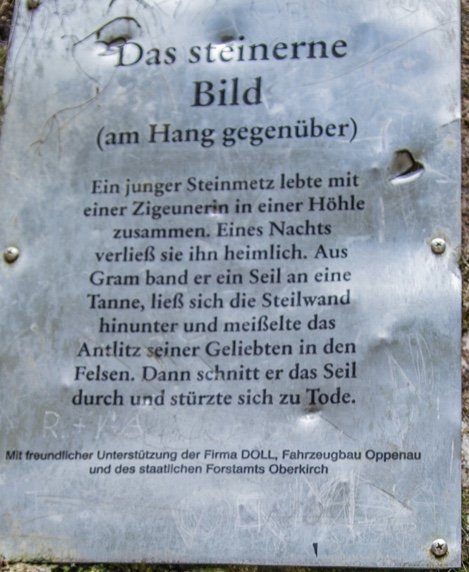 Einige Tafeln entlang des Weges berichten von schauerlichen Sagen über gottlose Pfarrer, mutige Reiter, Engel, Teufel, und einen Steinmetz, die hier passiert sein sollen.