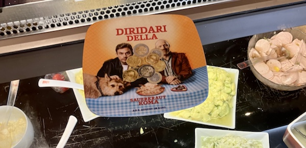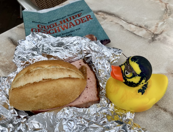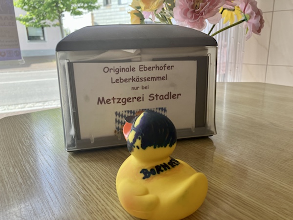 Der Metzger Stadler ist voll auf den Eberhofer Hype aufgesprungen und verkauft wochentags bis 18 Uhr und Samstags bis Mittags die original Franz Eberhofer Leberkässemmel am laufenden Band, wie der Simmerl im Film an den Franz. Mit süßem Senf natürlich.