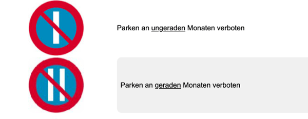 6. Parkverbot an Vorfahrtsstraßen und an gelben Linien am Fahrbahnrand. Blaue Markierungen kennzeichnen gebührenpflichtige Parkzonen, weiße gebührenfreie Parkzonen. Eine Besonderheit ist bei den Halteverbotsschildern zu beachten: Zeigen diese eine senkrechte Linie, gilt das eingeschränkte Halteverbot in den ungeraden Monaten und bei zwei Linien in den geraden.