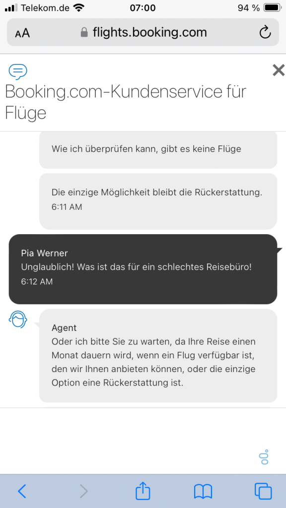 Dass booking.com Flugbuchungen auf eigenen Namen über ein fadenscheiniges Online-Reisebüro in Uppsala verkauft, das diese gar nicht gebucht hat und dann die Bearbeitung der Rückerstattung auf die „Refund Abwicklung“ der Airline schiebt, ist ungeheuerlich.