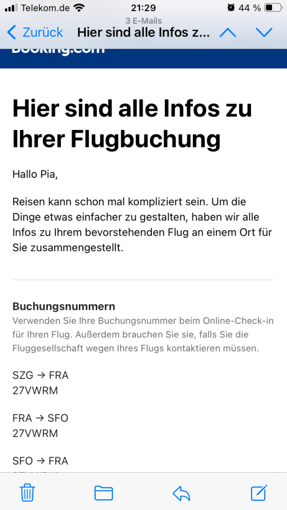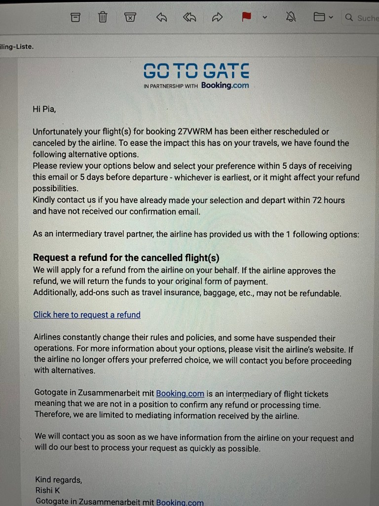 Letzte Woche erhielt ein Mail von Go to Gate, dass es Probleme mit meinem Flug gäbe. Wollte das Mail schon als Spam löschen, hatte ja bei booking gebucht.