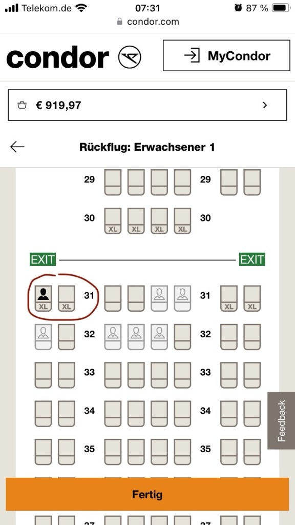 Dann fand ich bei booking.com die Flugbuchung und… hallo… hier konnte ich die gewünschten Flüge Lufthansa – Condor-Lufthansa via Frankfurt inklusive Sitzplatzreservierung problemlos mit den gewünschten Sitzen mit mehr Beinfreiheit buchen. Das war im November 2023. Also gleich gebucht und bezahlt.