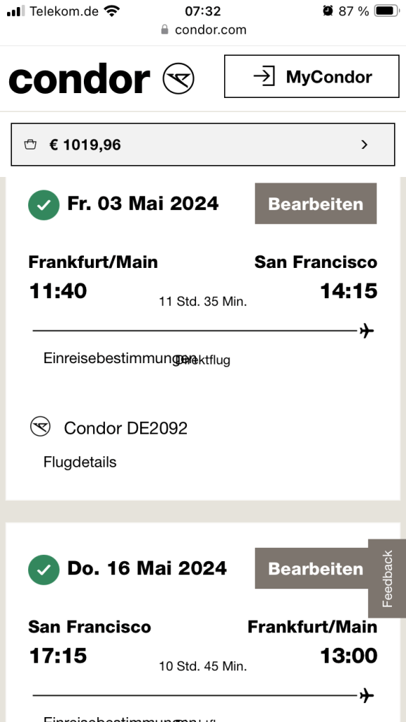 Die mir im Chat (Kommunikation nur durch Chat oder Mail möglich) mit Go to Gate erklärte Komplettstornierung des Rückfluges der Condor von San Francisco nach Frankfurt gibt es nicht, nur eine Zeitänderung um 2 Std.