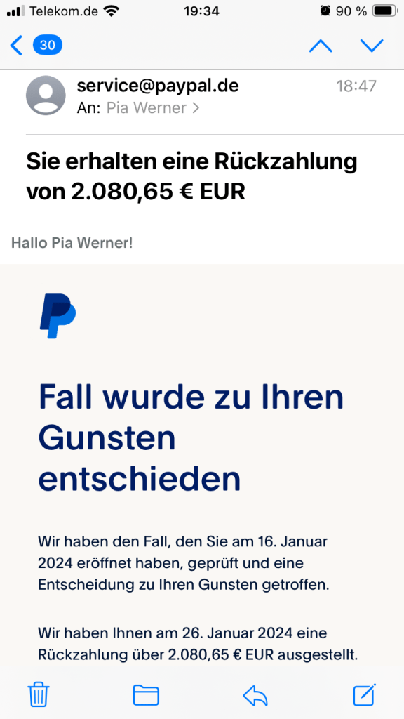 Heisst, wenn booking nicht in angemessener Zeit zahlt, bekomme ich im Februar sicher das Geld von paypal zurück.