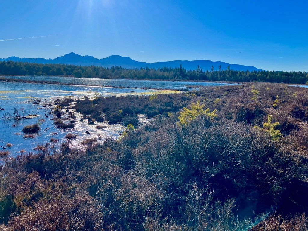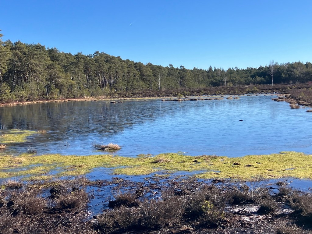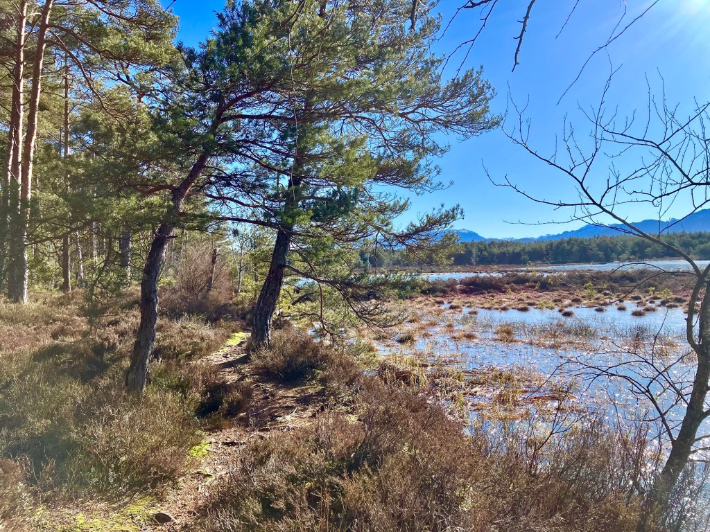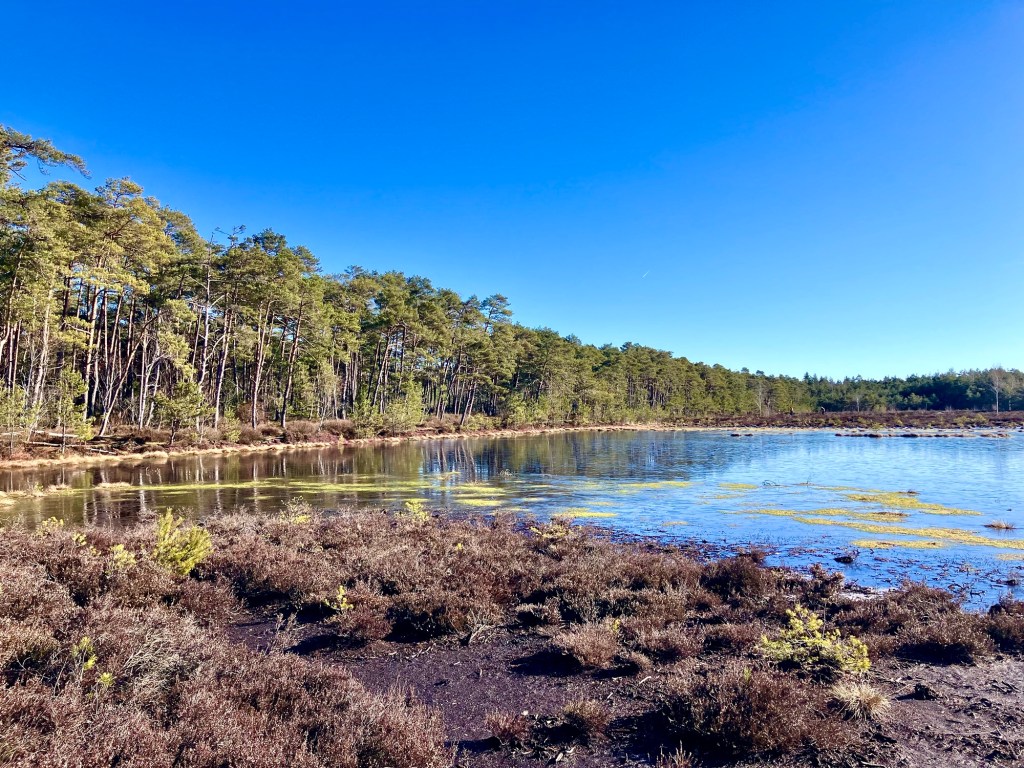 Hat man die hinter sich gelassen, geht es nicht über Stock und Stein, sondern über Wurzeln und Erika, umgestürzte Baumstämme und durch Moormatsch entlang des idyllischen Moorsees.
