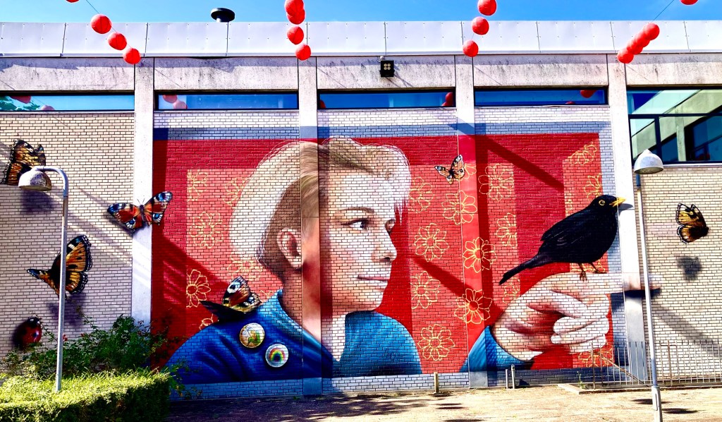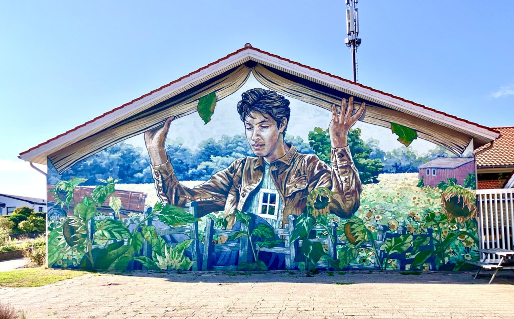Das zweite Mural ziert das Kulturhaus und zeigt einen jungen Mann in einem Sonnenblumenfeld, der als Dach ein Buch darüber hält.