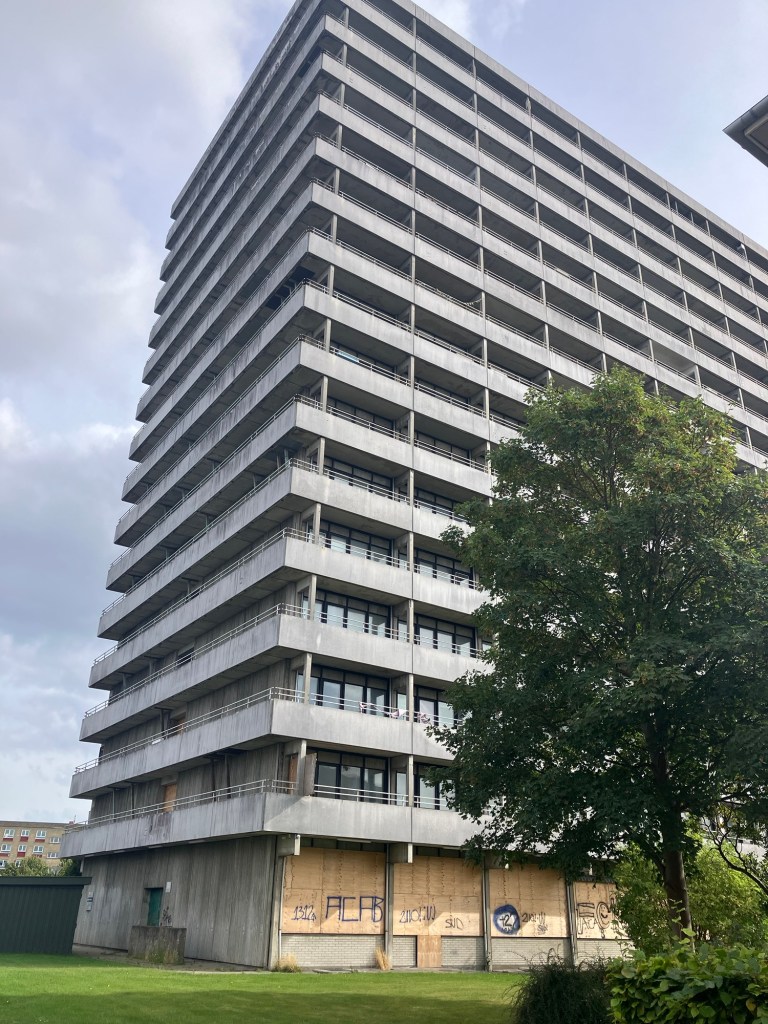Ein ziemlich trauriger Anblick in der Nähe von Suttetrolden Sanka am Englandsvej ist ein „Lost Place“ Hochhaus. Es wurde in den 1970er Jahren als modernstes Seniorenheim errichtet, doch bald brachte man die alten Menschen wegen fehlender oder mangelhafter Brandschutz- und Evakuierungsmöglichkeiten anderswo unter. Danach nutze man es als normales Apartmenthaus, bis Baumängel und bröckelnder Beton trotz ständiger Sanierungsbemühungen die Bewohnbarkeit unmöglich machten. 2013 wurde bereits der Abriss geplant, jetzt steht 2025 dafür im Raum.