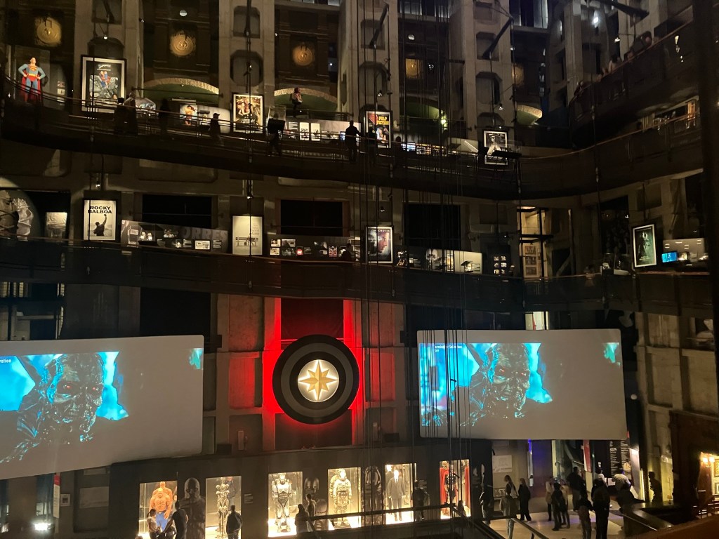Nun, wir hatten nicht rechtzeitig reserviert, an unserem Besuchstag war der Lift ganztägig ausgebucht. So haben wir nur das Kinomuseum besucht und uns über die mutigen Menschen gewundert, die ständig, in der Mitte des Museums wie Sardinen in der gläsernen Öldose an bloßen Seilen in schwindligen Höhen auf- und abfuhren.