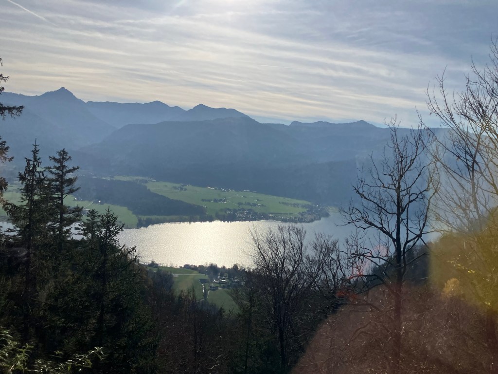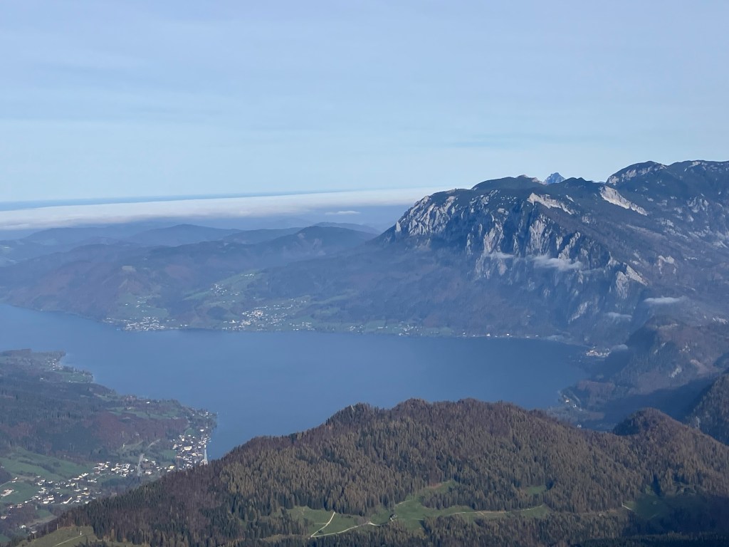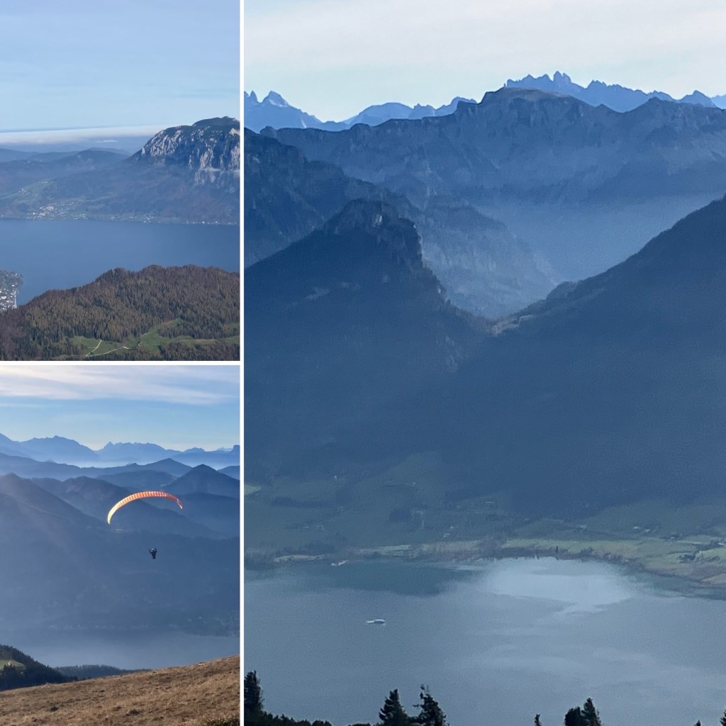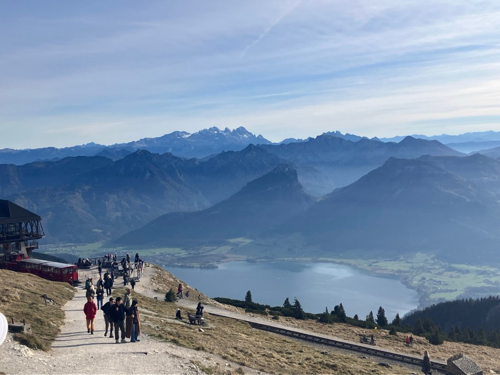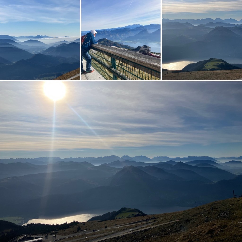 Oben angekommen, haben wir sofort verstanden, warum der Schafberg so beliebt ist. Die Sicht war wirklich unschlagbar: Direkt unter uns lag der Wolfgangsee in leuchtendem Blau, und dann in jeder Richtung ein weiterer: Fuschlsee, Mondsee, Irrsee und Attersee, eingebettet in die Berglandschaft. Wir haben uns Zeit genommen, das Panorama aus allen Blickwinkeln zu genießen.