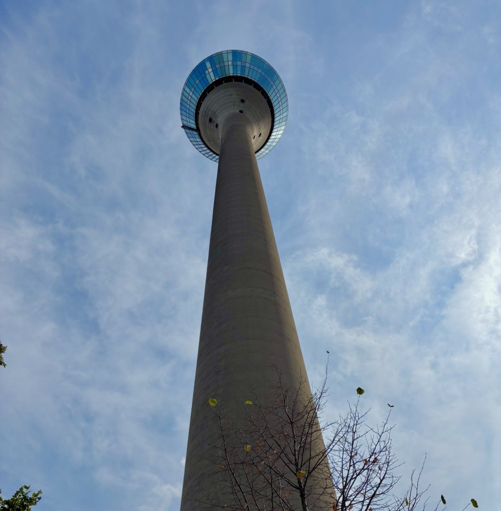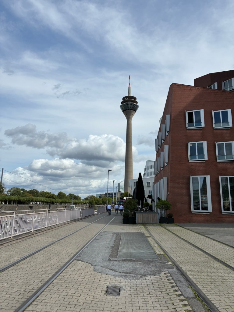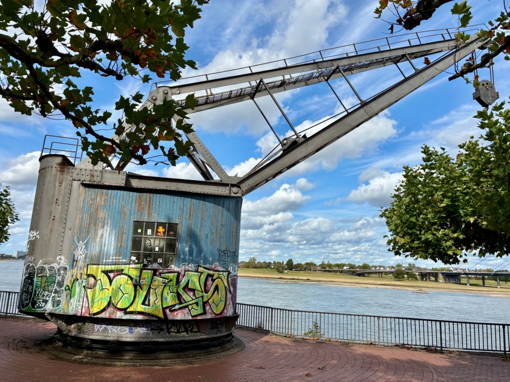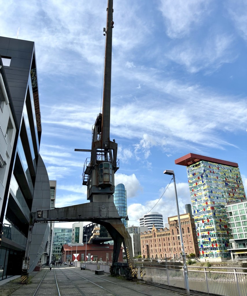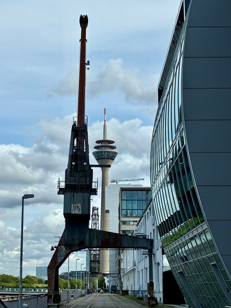 Dazu alte Hafenkräne vorm Rheinturm. Ein bisschen „Düsseldorf kann alles“, aber ehrlich: fotogen ist es.