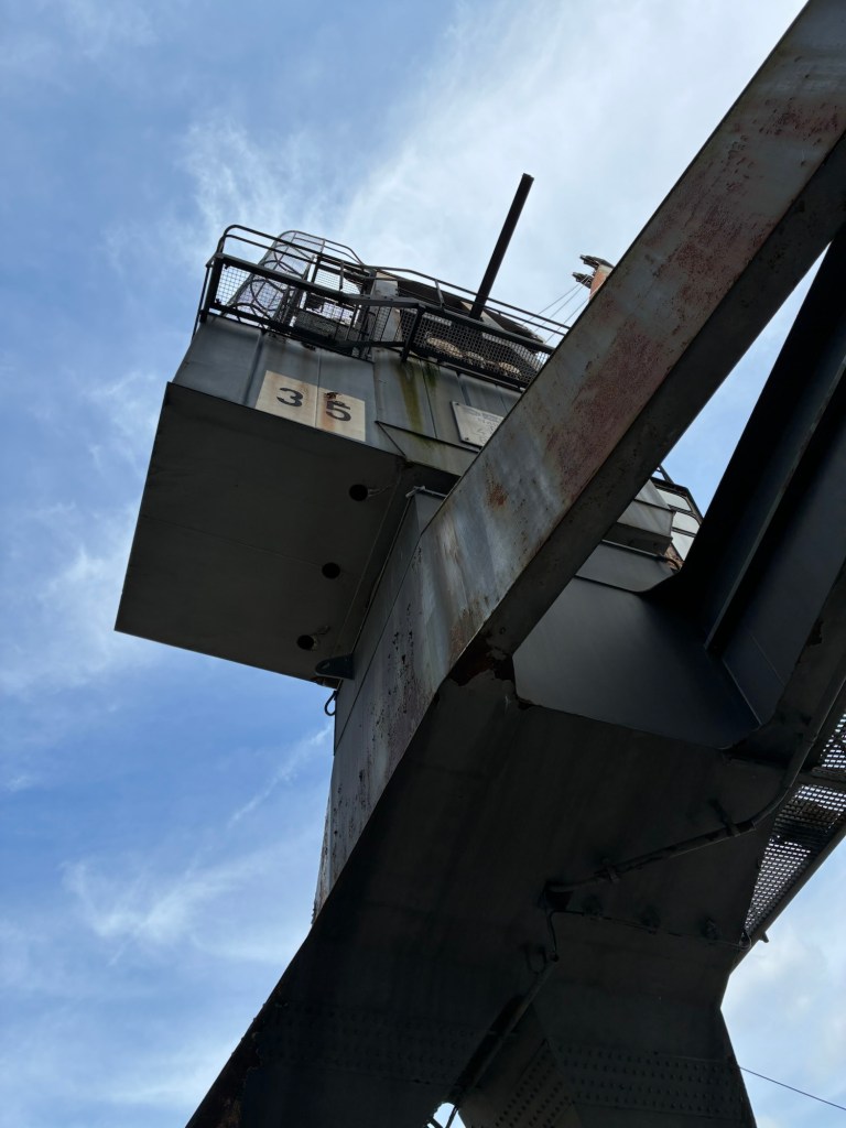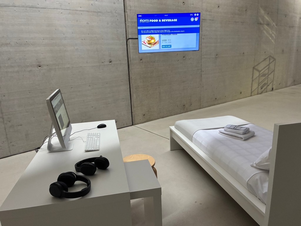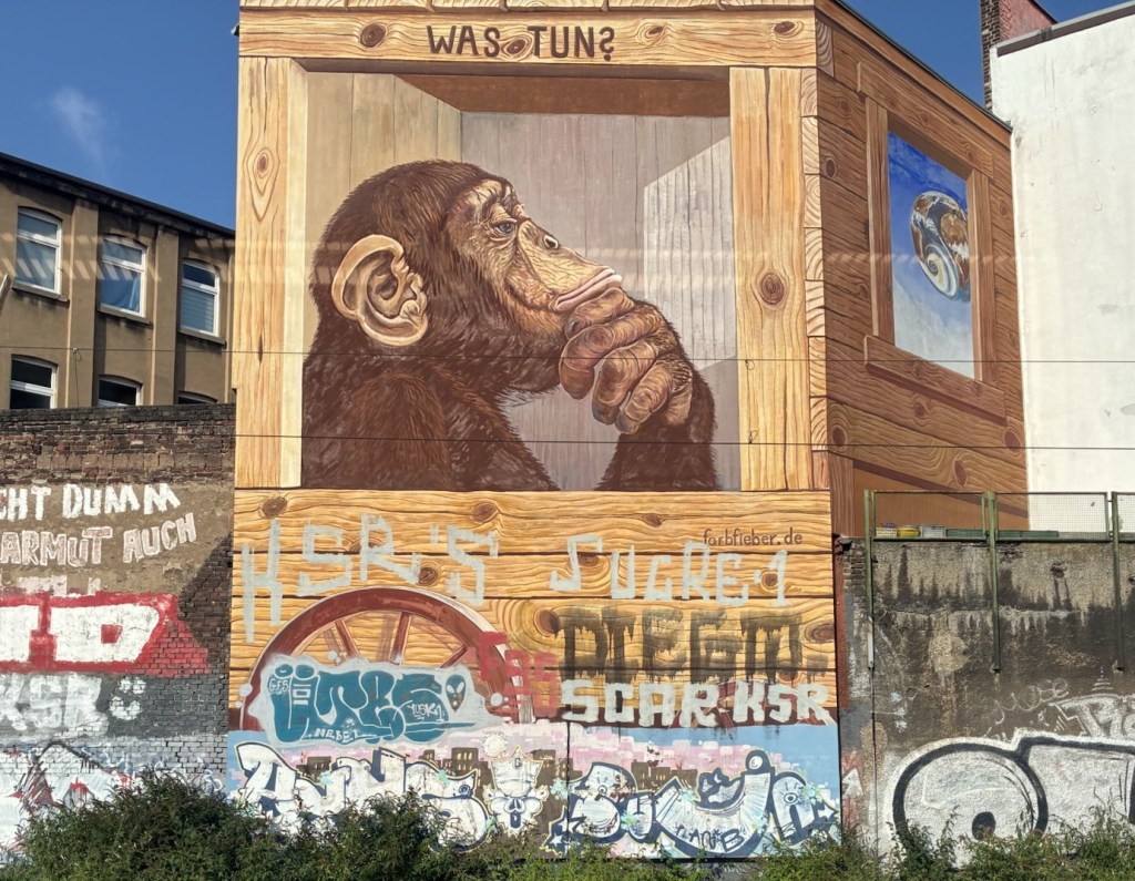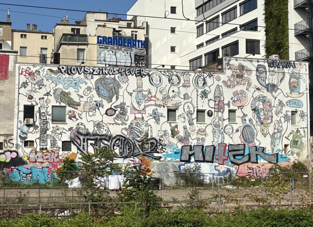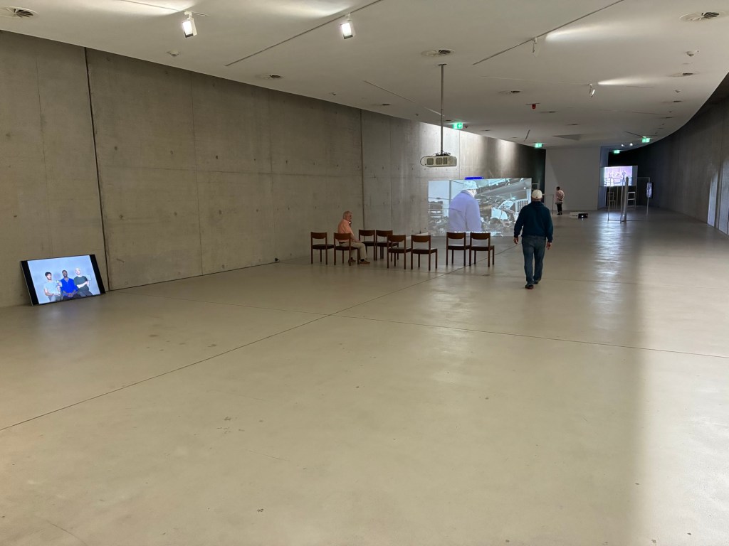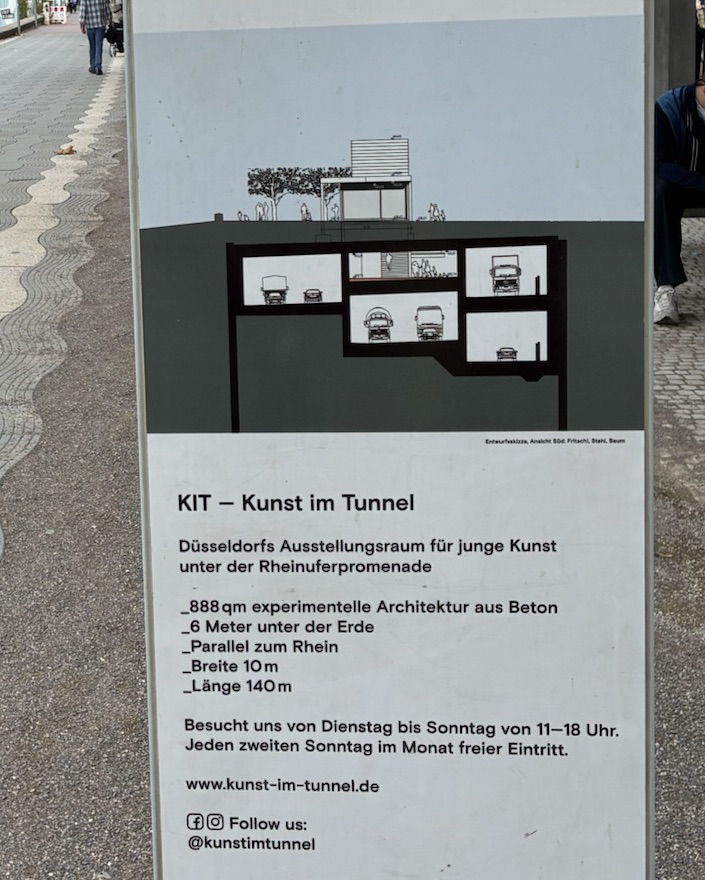 Wir bummelten weiter, entlang des Rheinufers und stiegen dann ab in den Untergrund: KIT – Kunst im Tunnel. Zwischen zwei Verkehrstunneln, minimalistischer Beton, schmal und trotzdem – oder deswegen – sehr atmosphärisch. Gerade läuft die Ausstellung „Human Work – Young Art from Münster“ (bis 5. Oktober 2025), die sich fragt, wie wir in Zukunft arbeiten, leben und mit Technik verschmelzen.