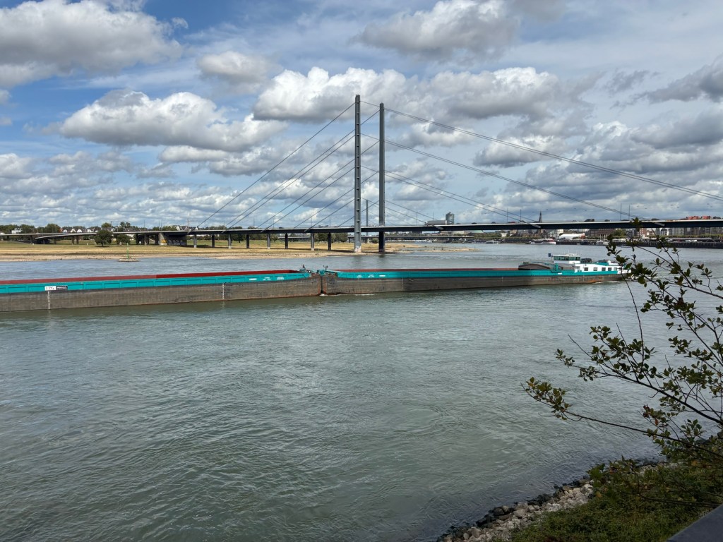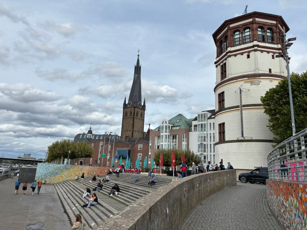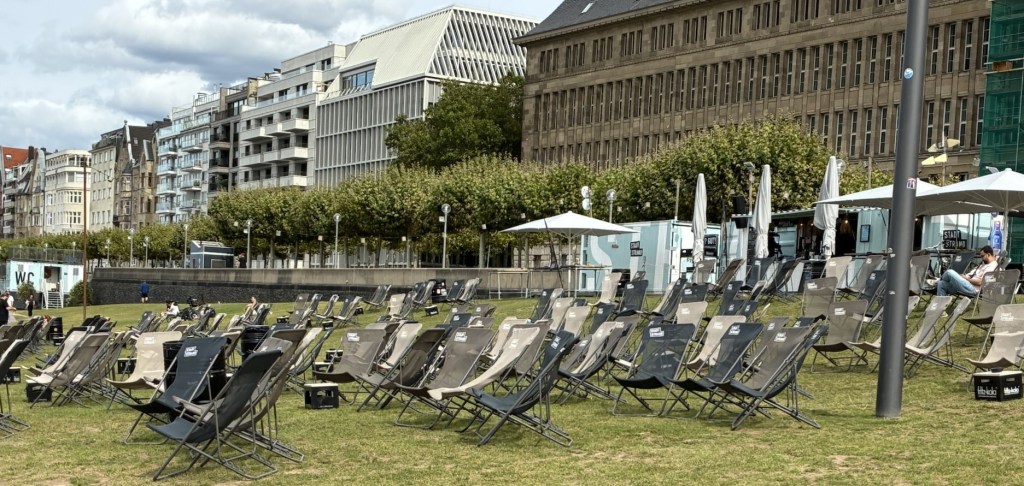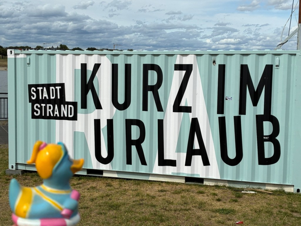 Für urbanes Urlaubsfeeling am Mannesmannufer fanden wir am Stadtstrand Liegestühle, dahinter Bars mit chilligen Beats und Blick auf den Rhein. Die Musik übertönte immerhin das Trillerpfeifenkonzert…