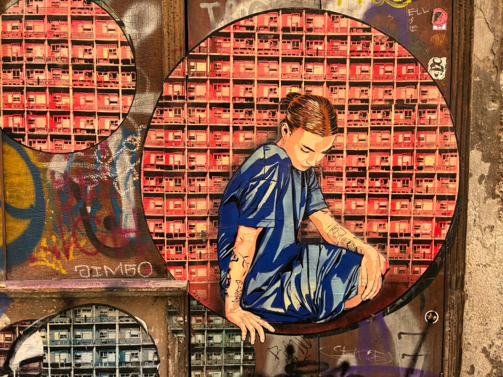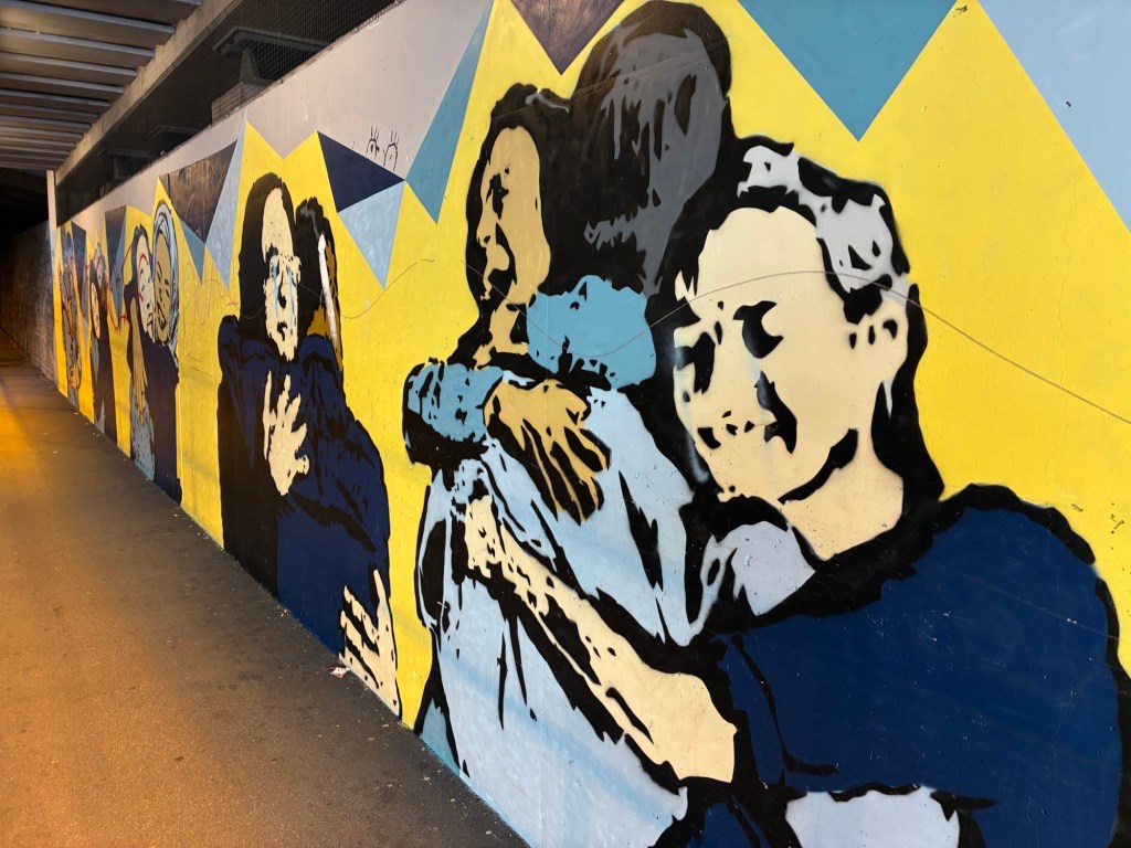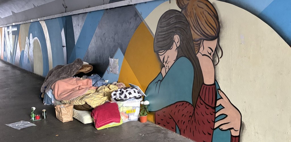 Dann die Unterführung in der Rainerstraße: Starke Murale mit irritierendem Detail. Diese Obdachlosenbleibe ist kunstvoll ins Gesamtbild eingefügt. Trotzdem keine Kunst, sondern Überlebenskampf: Das geht unter die Haut.