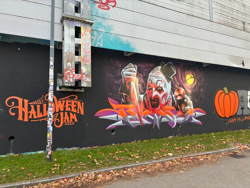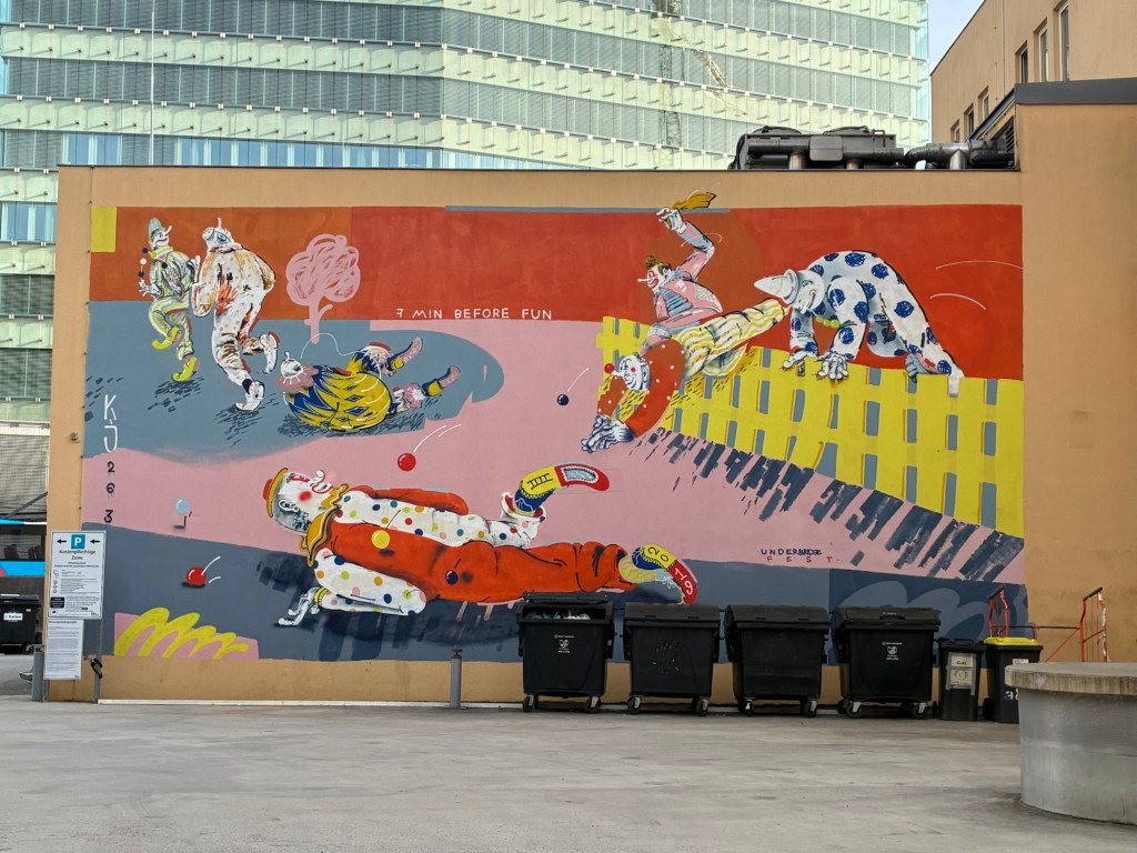 An der Rückseite des A&O Hostels: ein großes Clown-Mural, das man nicht übersehen sollte.