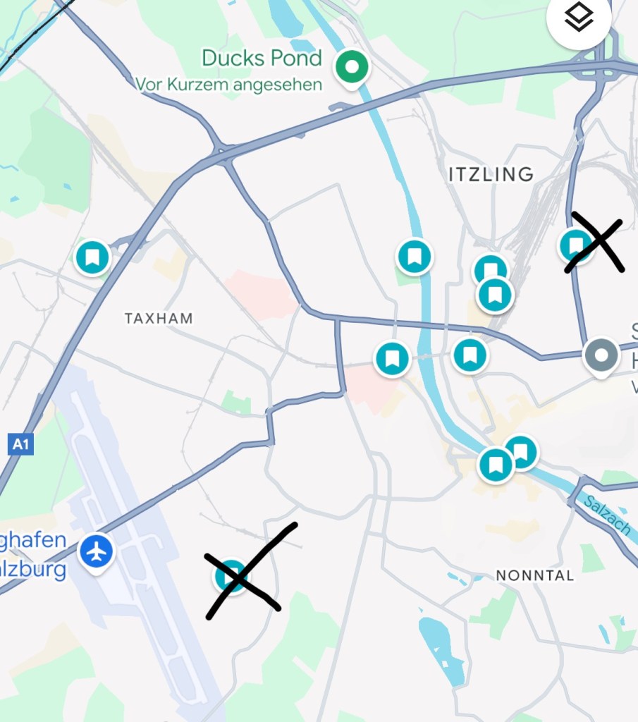 Gefunden haben wir nur zwei Garagen mit etwas Farbe – und ein Schild von Austria Salzburg: