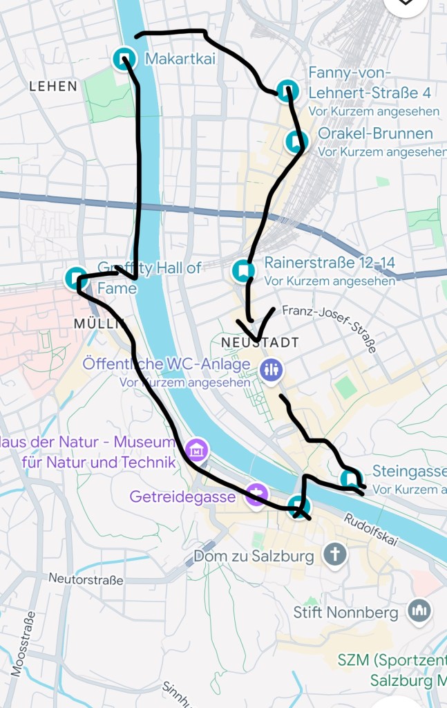 Citywalk: Mirabell → Steingasse → Staatsbrücke → Gaswerkgasse → Lehener Park → Bahnhof und zurück