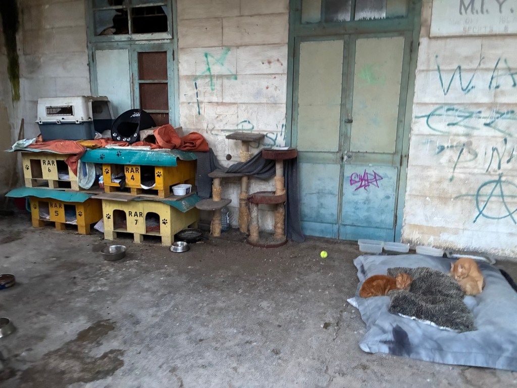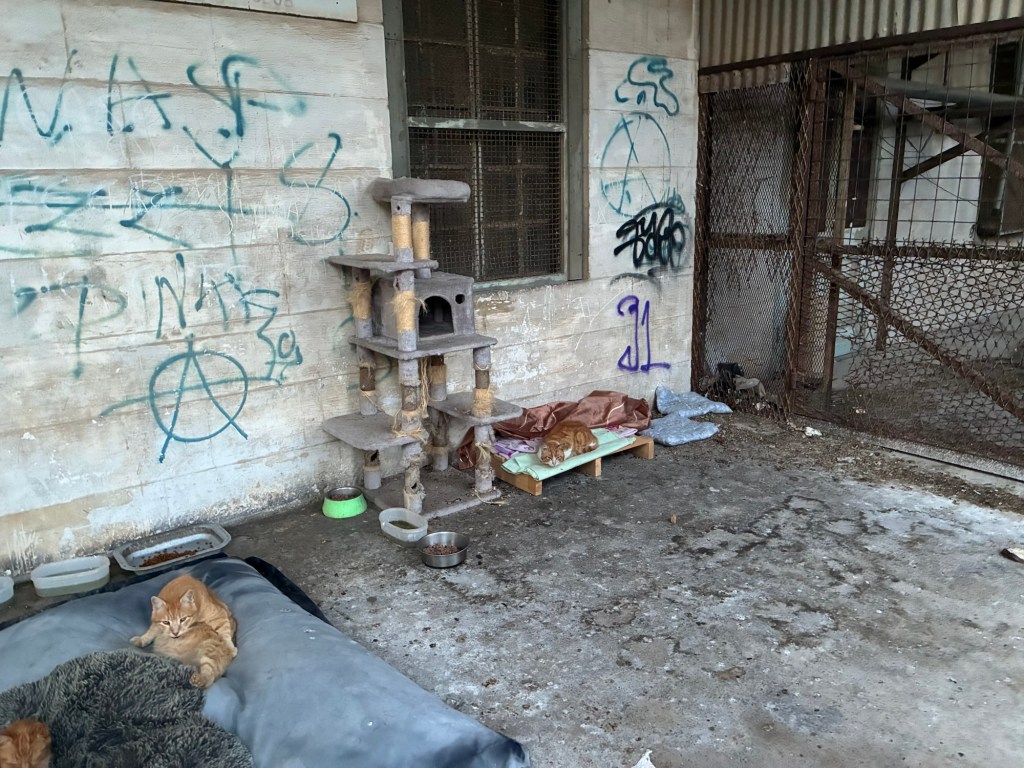 Improvisierte Holzhäuser, Katzenboxen. Näpfe. Decken. Kratzbäume. Katzen, zusammengerollt auf Matten, mitten in einem Gebäude, das eigentlich längst verlassen war.